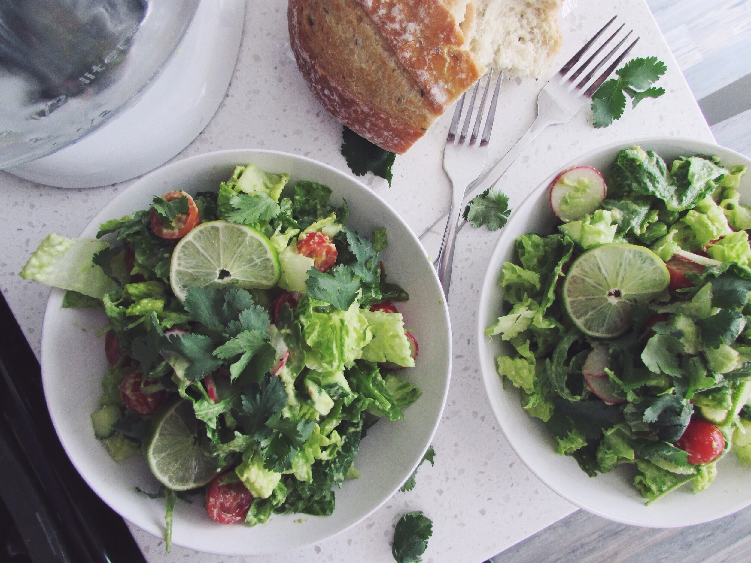Add the radish, cherry tomatoes, green onion, cucumber, cilantro, romaine and arugula to a large bowl. Mix in the dressing, and give it a good toss with tongs until the salad has been fully coated.