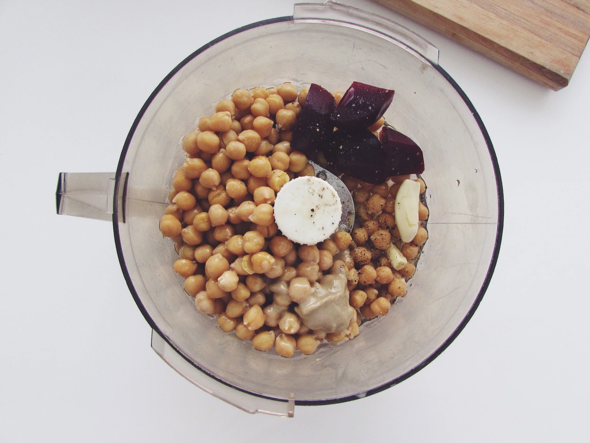 Add chickpeas, beets, garlic cloves, tahini, lemon juice, s+p and water to a food processor or high powered blender.