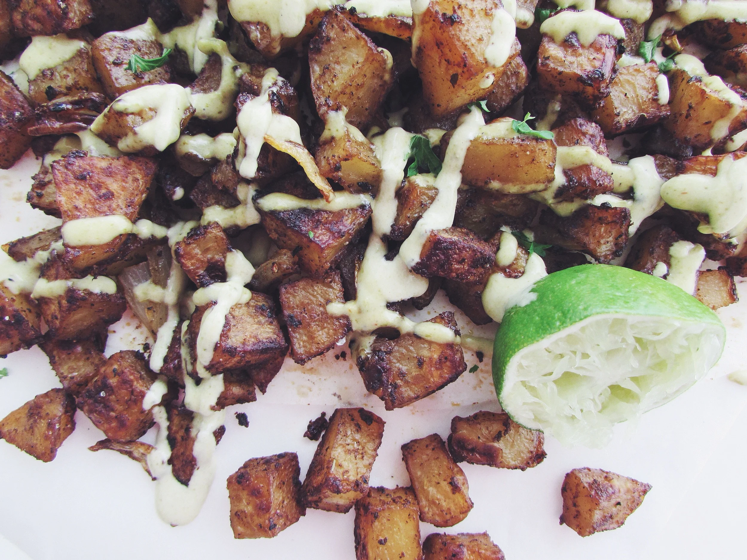 Chop potatoes into bite sized pieces. Place into a bowl with the onions, olive oil, chilli powder, s + p, paprika, garlic powder and dried oregano. Toss and transfer to a parchment lined baking sheet.