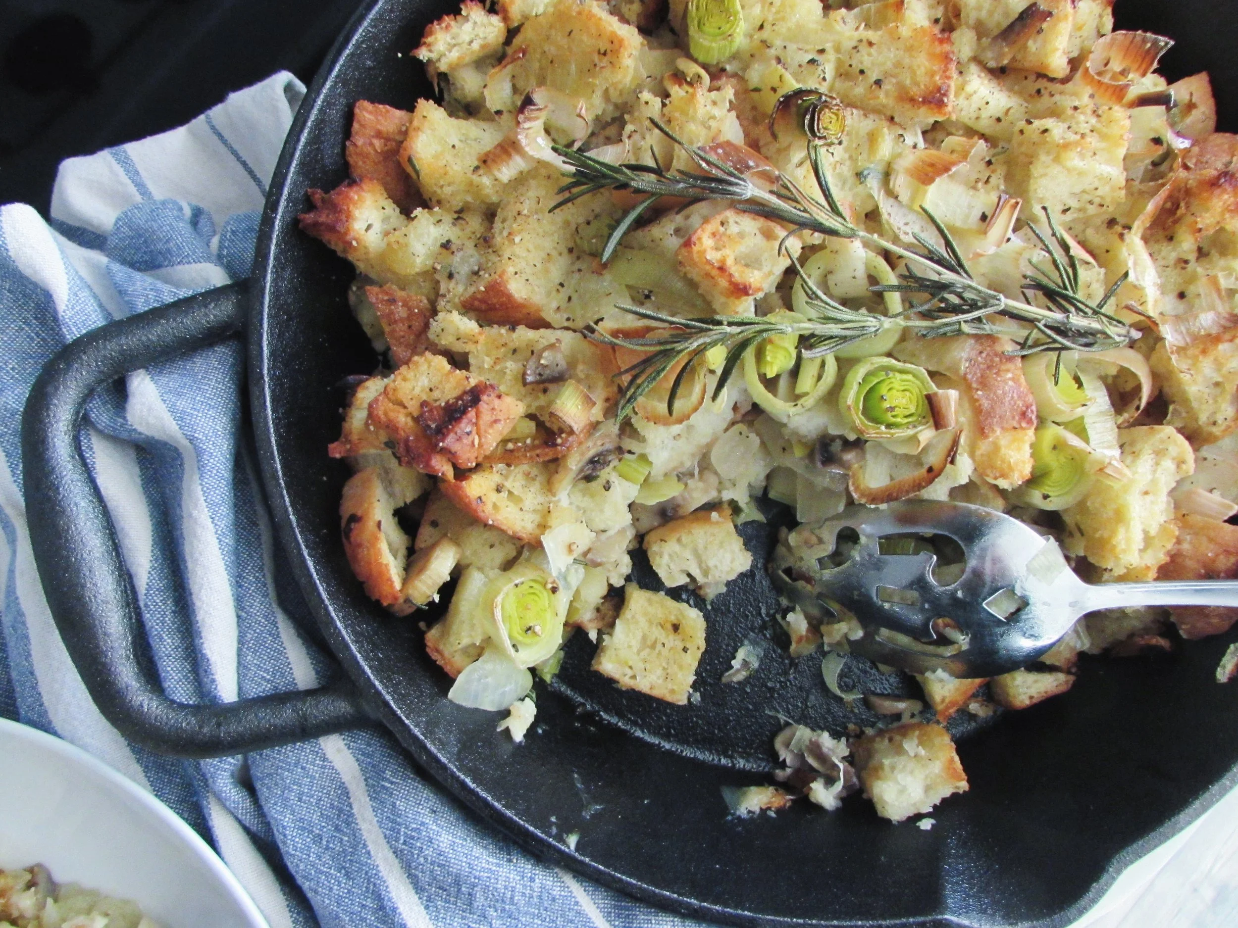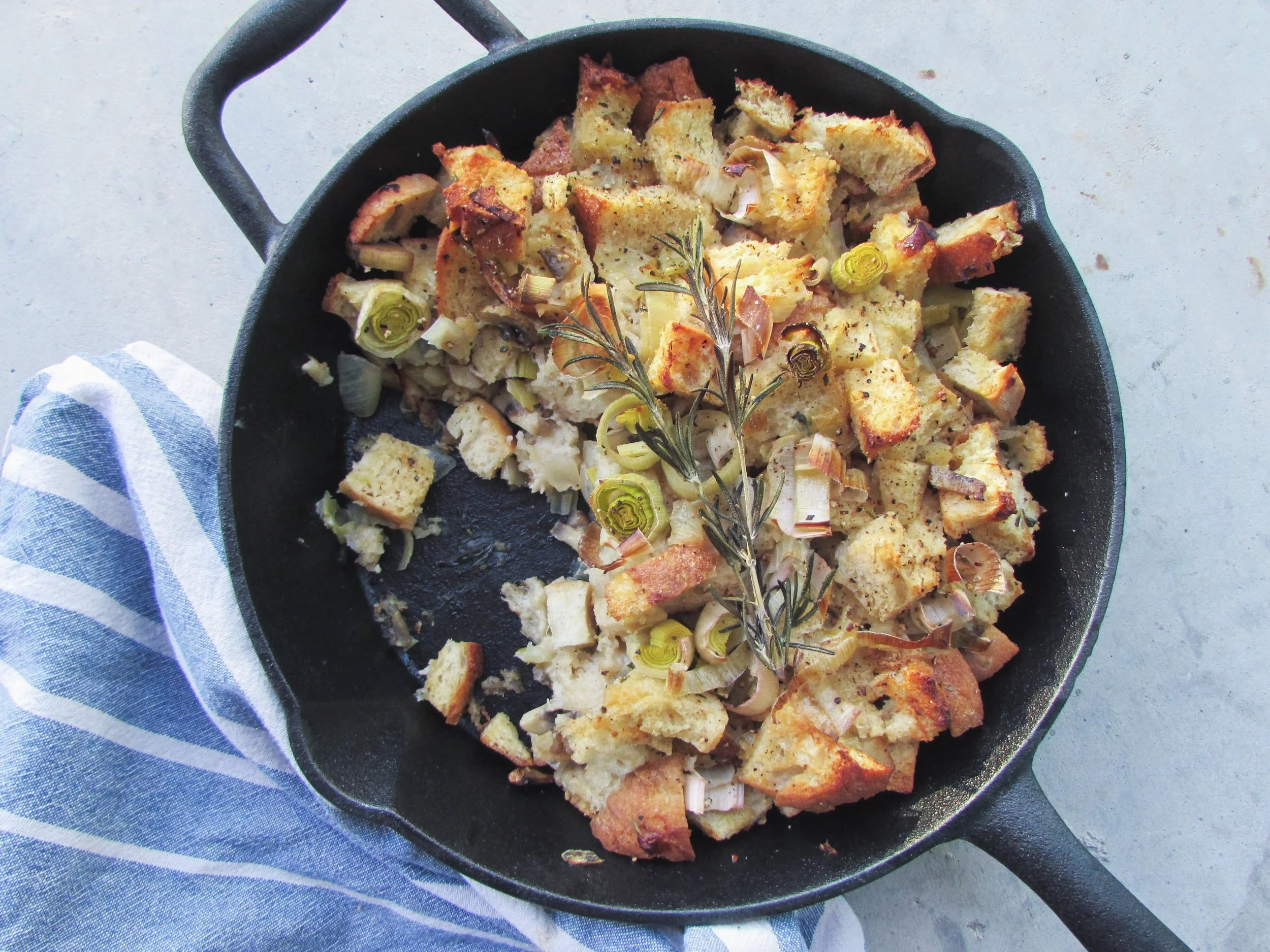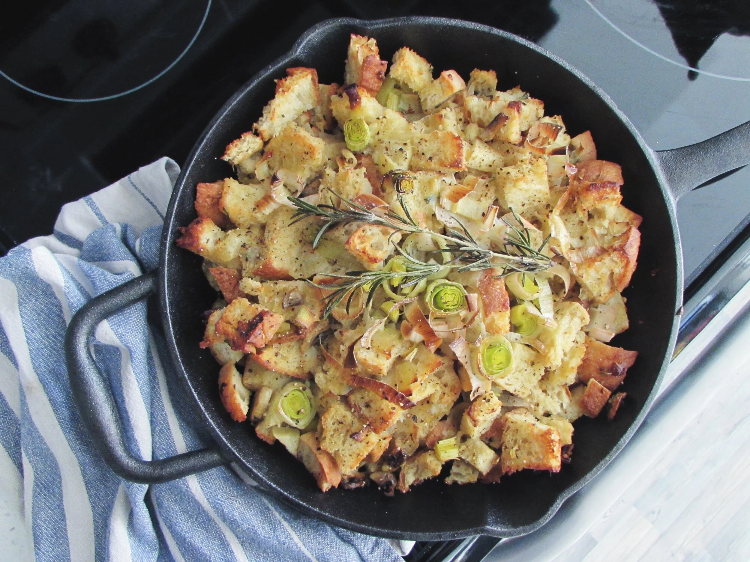 Add the coconut milk, vegetable stock and stale bread cubes to the skillet. Gently toss and top with a sprig of fresh rosemary. Bake for 30 minutes or until the top develops a nice colour and bread is crispy.
