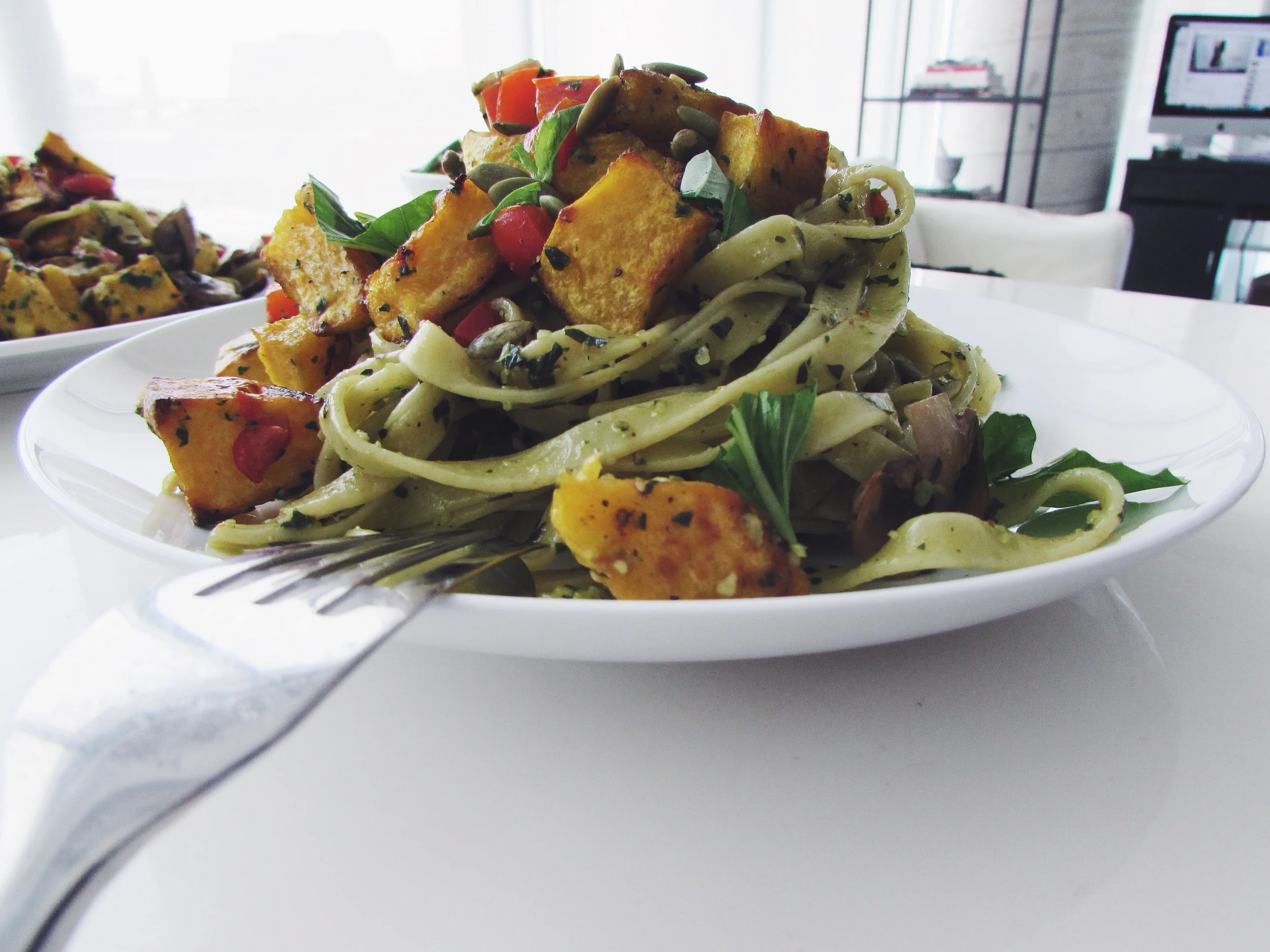 Gently toss the pasta and fresh basil pesto until fully coated. Add the baked squash, red pepper flakes, sautΓ©ed veg mixture and pumpkin seeds. Toss and top with fresh basil leaves.