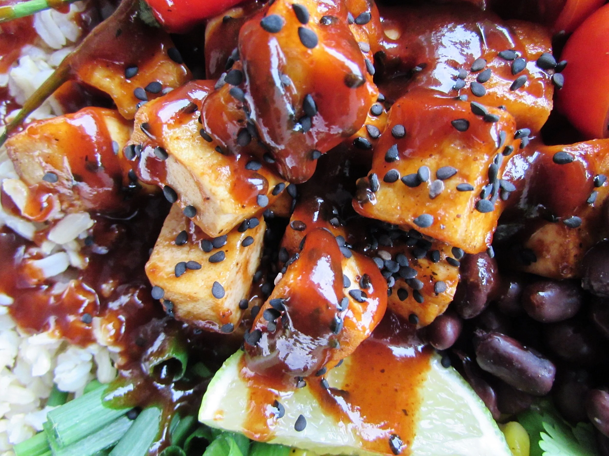Time to assemble - Grab a large bowl and fill it with the cooked rice. Add the toppings one by one on top of the rice, placing the tofu in the middle. Sprinkle the sesame seeds over the tofu and drizzle the remaining bbq sauce over top. To finish it off squeeze the juice from half a lime over top and dig in.