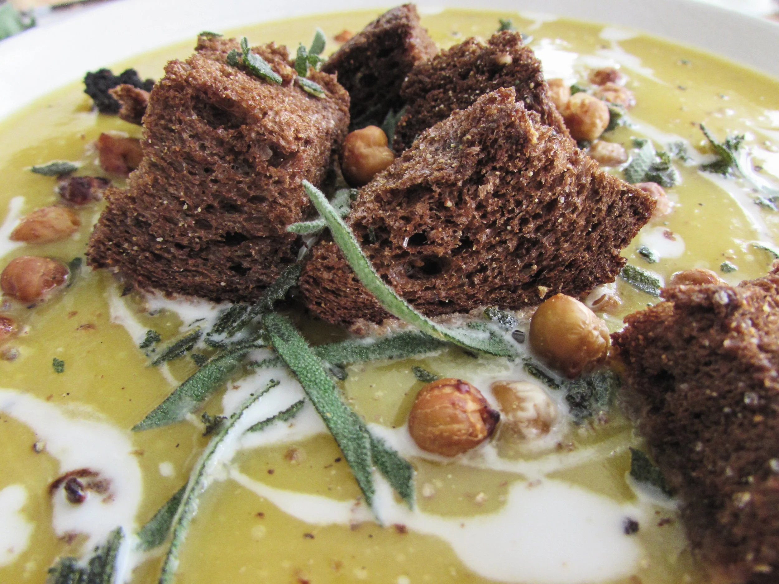 Fry the remaining sage leaves in a frying pan with 1 tsp of olive oil on low - medium for 2-3 minutes until crispy. I like to get creative and garnish this soup with croutons, baked chickpeas, fried sage leaves and a drizzle of coconut milk but it's really up to you!