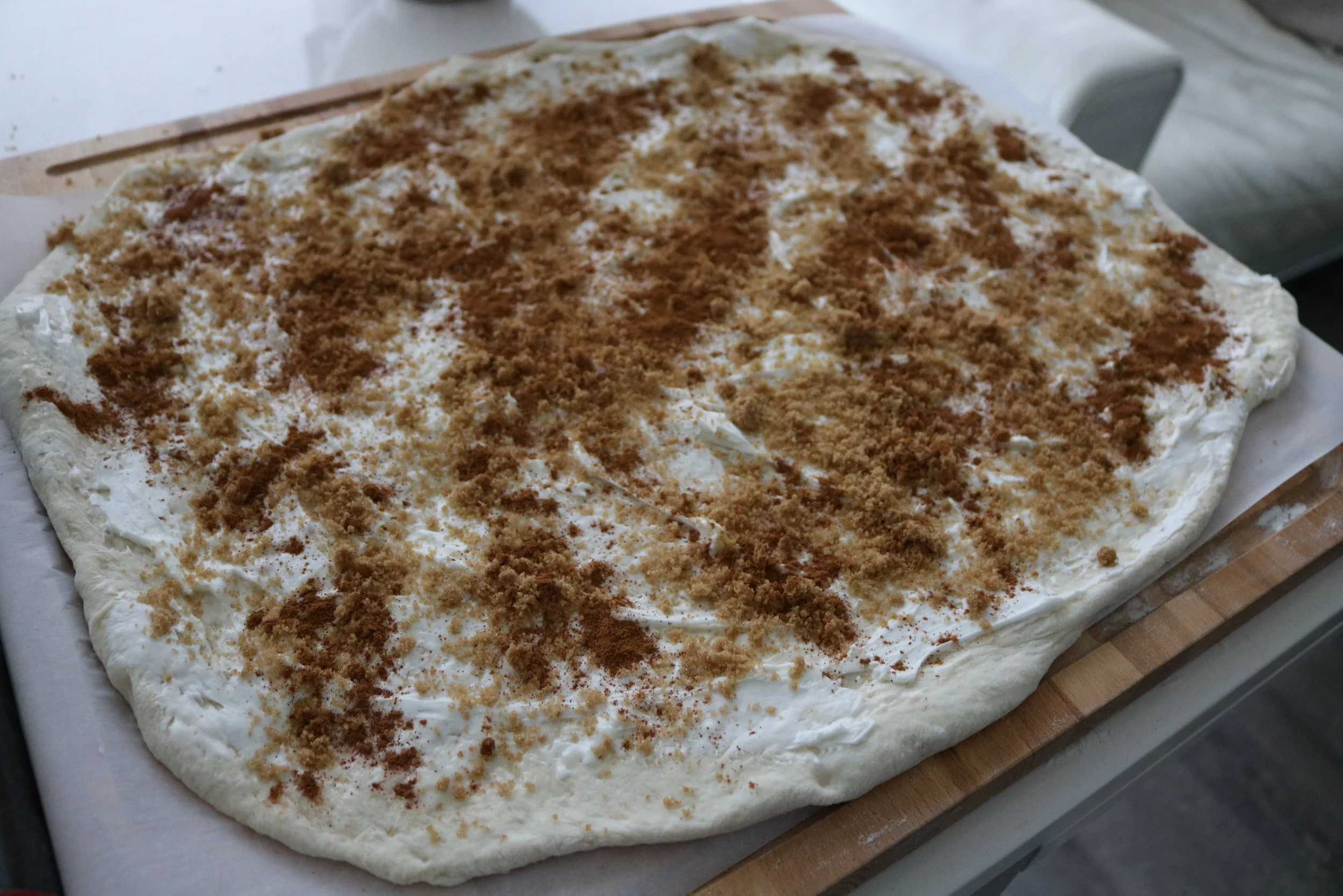 Using a rolling pin roll into a large square about a 1/4 inch thick. Melt half the butter and spread an even layer onto the rolled out dough surface. Repeat this step with half your icing. Sprinkle the brown sugar and cinnamon on top in an even layer as well so each bun has a bit of everything.