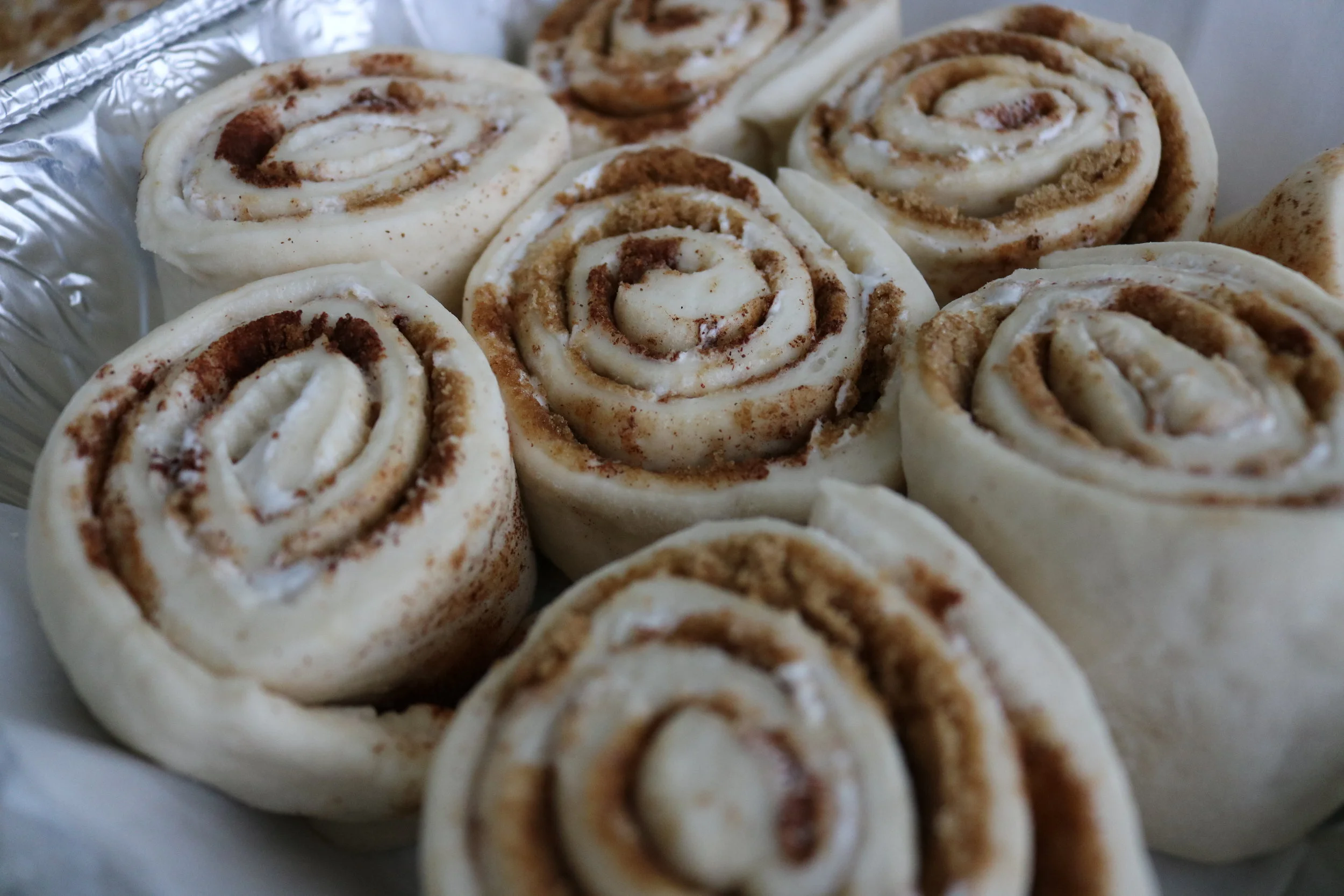 Place spiral side up in a parchment lined baking tray or for easy clean up I like to use a foil baking tray. This option is best if you are bringing the buns to a party or giving them away as you don’t need the pan back. You want the buns close to each other but give them a little room to spread out as they bake.