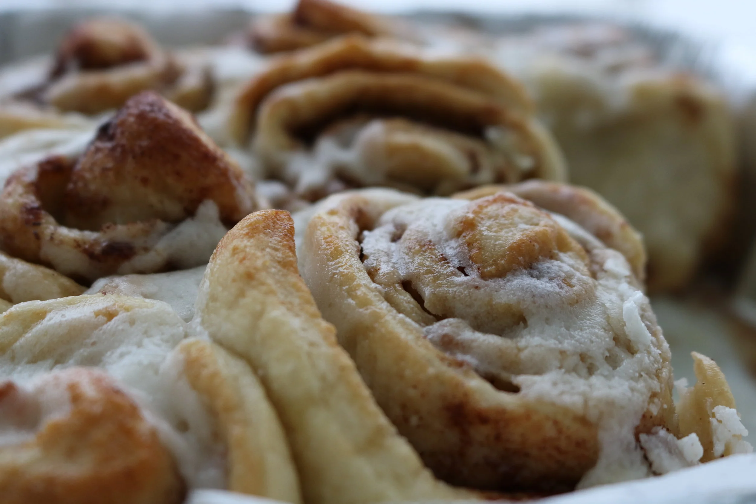 Brush the remaining melted butter on the top of the buns and bake for 45 minutes or until the top is brown and bubbly. You want a bit of a crust on the top but the inside to be soft. Remove from the oven and let sit for 5-10 minutes.